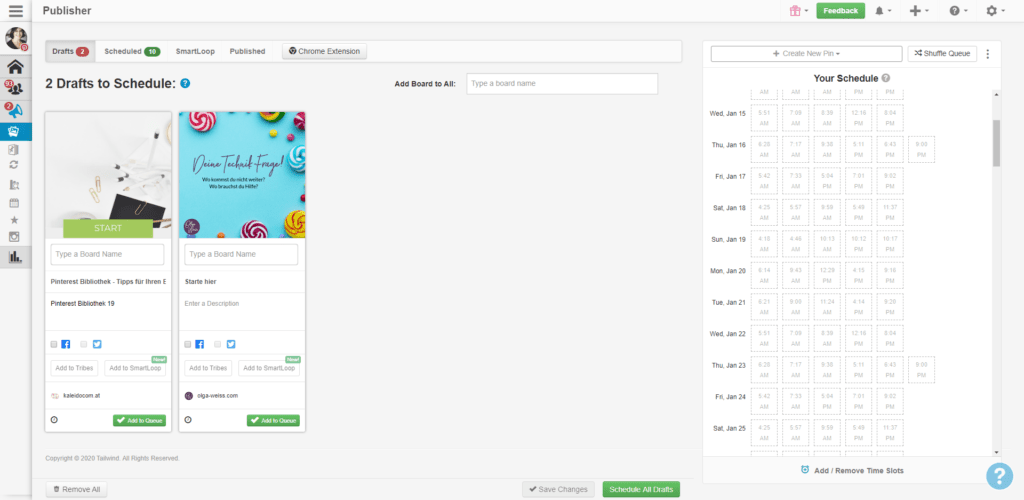Das Einplanen der Pins ist super einfach. Du wählst über den Button “Create Pin” deine Pin-Grafik aus, diese wird dann hochgeladen und dann wählst du die relevanten Pinnwände aus, vergibst einen Pin-Titel sowie eine Pin-Beschreibung und passt die URL an. Zum Schluss klickst du auf “Add to Queue “ und dein Pin wird in den nächsten freien Slot deines “Schedules” eingeplant und dann zu diesem Zeitpunkt veröffentlicht.